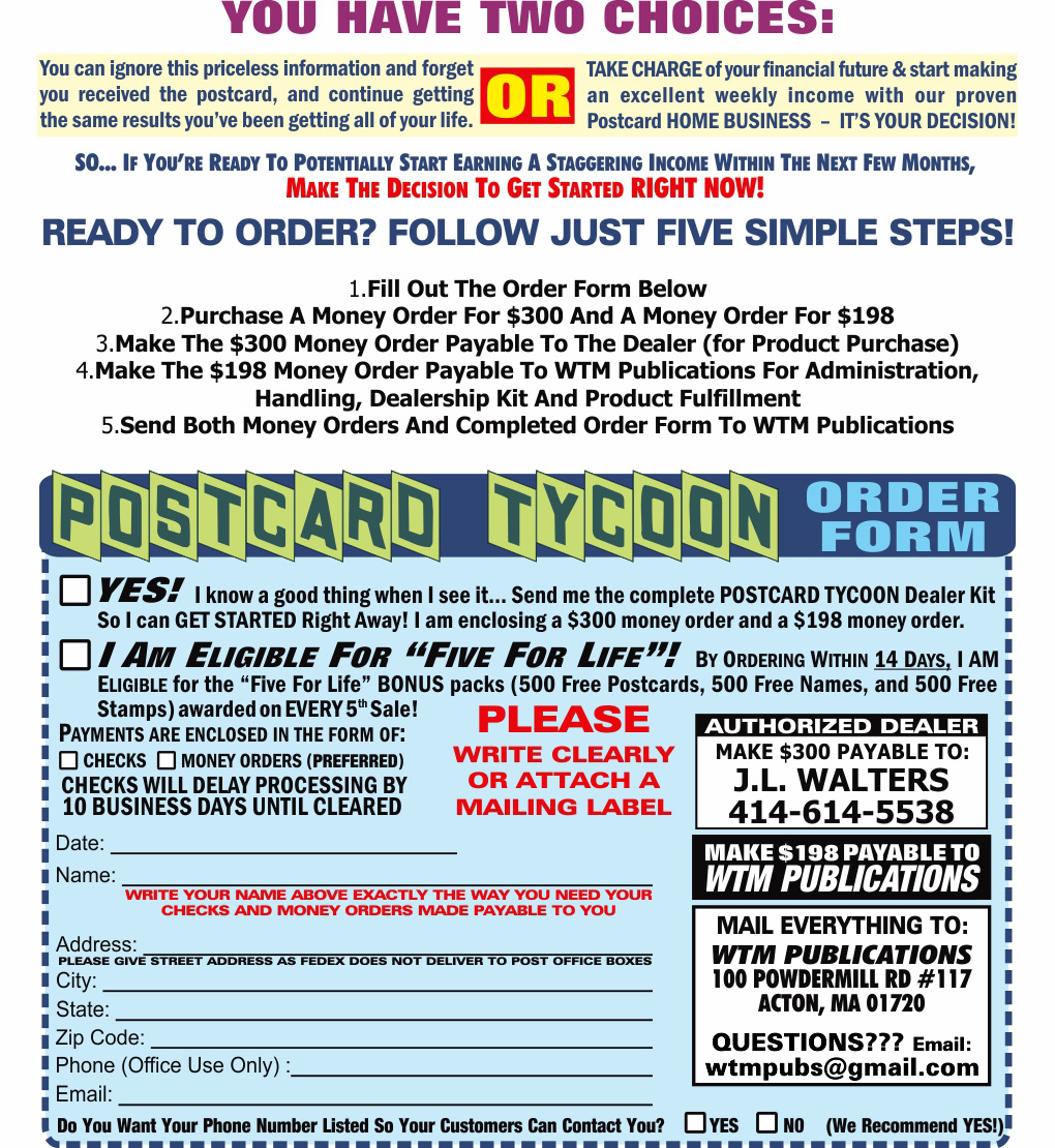CLICK HERE TO SEE THE FULL COLOR POSTCARD YOU CAN USE TO PROMOTE THIS CLICK HERE FOR A PRINTABLE POSTCARD ORDER FORM You must either ALREADY be an authorized Postcard Tycoon dealer with an ID number to order post cards, OR be ordering your Postcard Tycoon Dealer Kit AT THIS TIME to order extra postcards.